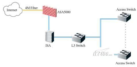 辦公專用網(wǎng)通過一條4M光纖線路連入CNC網(wǎng)絡(luò),在酒店內(nèi)部安裝了ASA5000和ISA等安全管理設(shè)備,ISA承擔(dān)了NAT等功能;辦公網(wǎng)的信息點(diǎn)數(shù)量大概在200個(gè)左右。