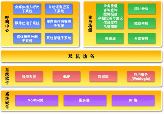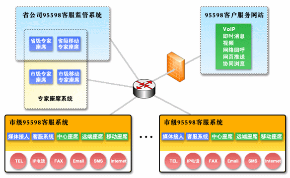 在電力客戶服務中心系統(tǒng)解決方案中,我們采用了更加先進的第四代呼叫中心系統(tǒng)作為客服系統(tǒng)的平臺?梢詫崿F(xiàn)的客戶聯(lián)絡方式已經不僅僅局限于傳統(tǒng)的語音和傳真的呼叫形式,網(wǎng)絡電話、網(wǎng)絡傳真、Email、短消息、即時消息、互聯(lián)網(wǎng)應用等都是與客戶聯(lián)絡的重要方式,涉及到的媒體載體也不僅是PSTN,還有基于VoIP技術的現(xiàn)代網(wǎng)絡、無線網(wǎng)絡等;也就是說第四代呼叫中心系統(tǒng)是一個融合網(wǎng)絡、語音、數(shù)據(jù)庫、視頻和安全技術的綜合信息服務平臺。整個95598電力客戶服務系統(tǒng)是由呼叫中心子系統(tǒng)和業(yè)務處理子系統(tǒng)共同構成。