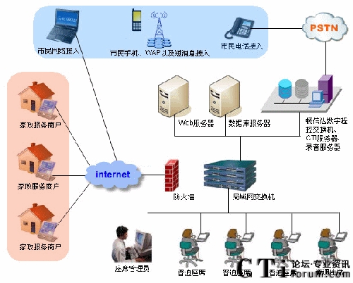 隨著國內(nèi)城市化地不斷加快,人口老齡化的加劇,人民群眾對(duì)家政服務(wù)需求也越來越旺盛,家政服務(wù)業(yè)的重要性也日益凸顯。為了規(guī)范家政服務(wù)市場(chǎng)、整合家政市場(chǎng)資源、培育家政服務(wù)示范性企業(yè),國家商務(wù)部、財(cái)務(wù)部于2009年4月下發(fā)了《關(guān)于推進(jìn)家政服務(wù)網(wǎng)絡(luò)體系建設(shè)的通知》的149號(hào)文件,啟動(dòng)了家政服務(wù)網(wǎng)絡(luò)中心體系建設(shè)的項(xiàng)目,并提出了具體的規(guī)范和要求。以此為起點(diǎn),為更好地服務(wù)社會(huì)滿足人民群眾日益增長的生活需求而努力。自文件下發(fā)以來,我公司就組織專門的項(xiàng)目組,對(duì)家政服務(wù)行業(yè)具體業(yè)務(wù)需求的調(diào)研以及開發(fā)工作。公司利用多年的開發(fā)經(jīng)驗(yàn),經(jīng)過幾個(gè)月的努力,終于在8月份完成了暢信達(dá)家政服務(wù)網(wǎng)絡(luò)中心的全套建設(shè)方案。與其它系統(tǒng)固化的功能設(shè)計(jì)不同,該方案可以靈活地定制業(yè)務(wù)模塊,方便各地的家政公司根據(jù)本市的情況和需求,確定適合自身的業(yè)務(wù)流程。系統(tǒng)業(yè)務(wù)模塊完整地覆蓋了家政服務(wù)的業(yè)務(wù)范圍與重點(diǎn)。并將家政服務(wù)的業(yè)務(wù)分為營業(yè)系統(tǒng)、賬務(wù)系統(tǒng)、后臺(tái)系統(tǒng)等部分,貫穿了市民從訴求提交、工單派發(fā)、工單處理、財(cái)務(wù)結(jié)算到回訪反饋的各個(gè)方面。系統(tǒng)還提供了完善的報(bào)表模塊準(zhǔn)確反映業(yè)務(wù)和系統(tǒng)運(yùn)營狀況,有力地支持對(duì)平臺(tái)進(jìn)行運(yùn)營管理工作。另外在方案設(shè)計(jì)上,除了滿足業(yè)務(wù)處理需要外,還充分考慮到系統(tǒng)的適應(yīng)性、穩(wěn)定性和處理的能力。首先為了滿足各地市對(duì)家政平臺(tái)的不同需求,公司專門推出了基于IBM服務(wù)器的和暢信達(dá)標(biāo)配服務(wù)器的兩種建設(shè)方案。暢信達(dá)標(biāo)配服務(wù)器方案可提供最低4模擬外線最多1條數(shù)字中繼(E1)接入,適用于初期規(guī)模較小且投資規(guī)模不大的客戶。而基于IBM服務(wù)器的方案,則主要是滿足業(yè)務(wù)量較大,同時(shí)對(duì)設(shè)備配置要求高的城市,以數(shù)字線接入為主。多種建設(shè)模式充分體現(xiàn)了方案的靈活性、可擴(kuò)展性的特征,有效地減少了運(yùn)營風(fēng)險(xiǎn),提升了個(gè)性化定制化服務(wù)的水平。其次,根據(jù)家政市場(chǎng)需求預(yù)測(cè)以及已開通家政服務(wù)網(wǎng)絡(luò)中心城市的實(shí)際運(yùn)營情況,一個(gè)中型城市,預(yù)計(jì)電話開通之后,話務(wù)量平均每天近3000個(gè),這就要求系統(tǒng)不但有穩(wěn)定的性能而且要有強(qiáng)大的處理能力。我公司從系統(tǒng)平臺(tái)構(gòu)建、業(yè)務(wù)流程設(shè)計(jì)、設(shè)備性能、組網(wǎng)設(shè)計(jì)等方面著手,為系統(tǒng)提供了足以確保安全穩(wěn)定運(yùn)行的支持。