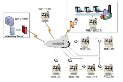 新疆建設(shè)兵團(tuán)工會(huì)下設(shè)有14個(gè)師工會(huì),111個(gè)團(tuán)場(chǎng)工會(huì).共有200個(gè)用戶同時(shí)參加視頻會(huì)議。中心服務(wù)器帶寬為100M光纖,各地終端通過網(wǎng)通2M寬帶接入,每個(gè)師、團(tuán)級(jí)會(huì)場(chǎng)都有自己獨(dú)立的機(jī)房和會(huì)議室,適合進(jìn)行基于IP網(wǎng)絡(luò)視訊會(huì)議的應(yīng)用,在這個(gè)網(wǎng)絡(luò)平臺(tái)上,優(yōu)視(URSACOM)HotMeeting富媒體視頻會(huì)議系統(tǒng)所提供的高質(zhì)量的視頻圖像和方便易用的文檔、文件共享功能,使得兵團(tuán)工會(huì)領(lǐng)導(dǎo)能夠在這個(gè)平臺(tái)上進(jìn)行從桌面討論到會(huì)議室正式會(huì)議等各種規(guī)模應(yīng)用。通過HotMeeting富媒體視頻會(huì)議系統(tǒng),除了進(jìn)行全團(tuán)工會(huì)系統(tǒng)例會(huì),工作交流等常見的應(yīng)用之外,遠(yuǎn)程培訓(xùn)等也是經(jīng)常進(jìn)行的內(nèi)容。各個(gè)師、團(tuán)工會(huì)系統(tǒng)能利用數(shù)據(jù)功能和兵團(tuán)總工會(huì)協(xié)調(diào)業(yè)務(wù),也能把平常培訓(xùn)的會(huì)議材料進(jìn)行詳細(xì)介紹,節(jié)約了以前培訓(xùn)所花費(fèi)的大量精力和時(shí)間。具體網(wǎng)絡(luò)拓?fù)湟娤聢D: