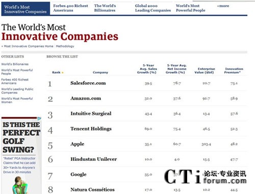CTI論壇(ctiforum)8月15日消息(記者 張潔):2011年7月,由美國(guó)知名財(cái)經(jīng)雜志《福布斯》評(píng)選出的全球百大最具創(chuàng)新能力企業(yè)排行榜上,salesforce.com超越Facebook、蘋(píng)果、亞馬遜等知名企業(yè)位列第一。