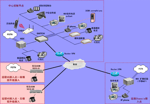 ③.遠(yuǎn)程接入的辦公室不再需要專用的 PBX, 只需要將3Com NBX電話終端接入到WAN網(wǎng)中,就能地實(shí)現(xiàn)在WAN或Internet上與3Com NBX 網(wǎng)絡(luò)電話系統(tǒng)的互連。