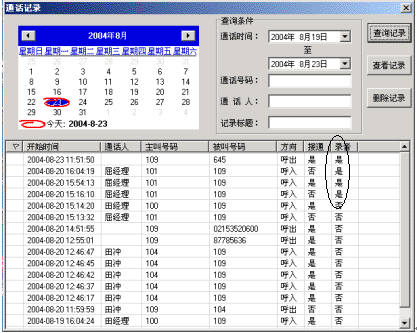 當(dāng)您在接打電話時(shí),可以利用 NBX-TCA對(duì)當(dāng)前的通話進(jìn)行錄音,以方便您對(duì)重要信息的記錄和查找。您可以在通話記錄中對(duì)已錄音的記錄進(jìn)行查找,如下圖所示。打開通話記錄,選擇按錄音查找方式查看已有的錄音即可。