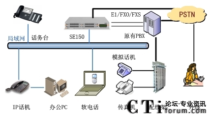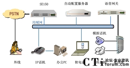 分布式部署:總部和各分支機構的分機,是通過IP網絡融合在一個語音平臺上來實現(xiàn)內部通信?偛亢娃k事處分機、家庭辦公分機、出差人員的軟電話均注冊在總部的SE150上,各分公司的分機注冊在本地的SE150上,由本地的SE150管理。