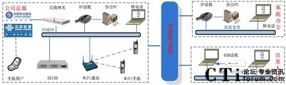 此方案適用于具有“移動辦公、頻繁出差、家庭辦公”需求的企業(yè)。系統(tǒng)要求企業(yè)內部部署好數(shù)據(jù)網絡,如果采用模擬終端,則企業(yè)的各個辦公點需要先將網絡線路和電話線路部署到位。如果需要應用WIFI終端,則需要部署WIFI網絡。