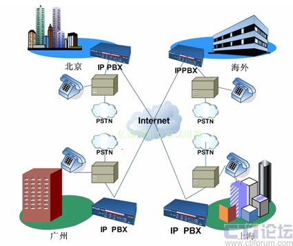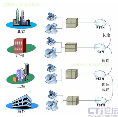各分支機(jī)構(gòu)租用獨(dú)立的電話號(hào)碼并接入當(dāng)?shù)豍STN,在這種架構(gòu)下,各地之間通話就會(huì)產(chǎn)生長(zhǎng)途費(fèi)用,并占用電話線路,但如果使用IP