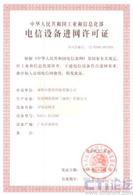 CTI論壇(ctiforum)05月15日消息: 日前從深圳市震有科技有限公司傳出消息,公司自主研發(fā)的NuBiz NC5200 IP電話網(wǎng)關(guān)設(shè)備順利通過工業(yè)和信息化部電信設(shè)備認(rèn)證中心的審核,取得“電信設(shè)備進(jìn)網(wǎng)許可證”。此舉標(biāo)志著震有科技的NuBiz交換產(chǎn)品已成功取得進(jìn)入國(guó)家電信網(wǎng)的資質(zhì),為大規(guī)模電信級(jí)推廣應(yīng)用打下了基礎(chǔ)。
