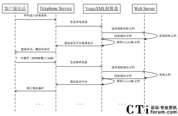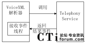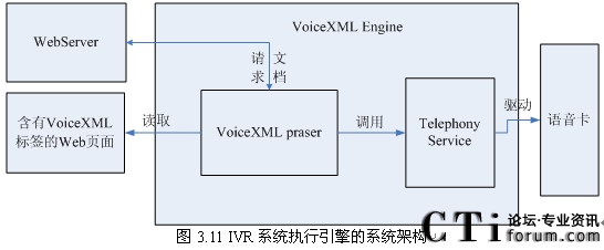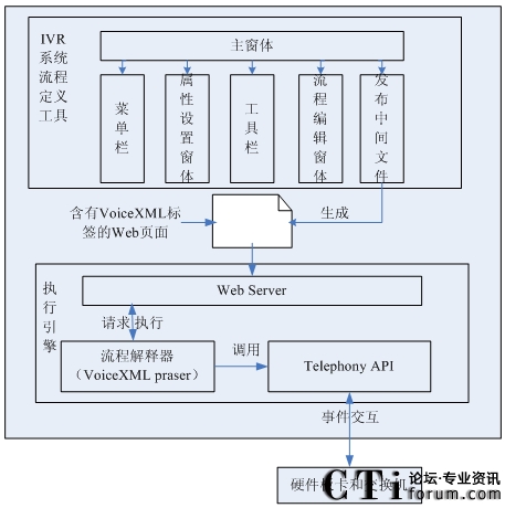 而IVR系統(tǒng)執(zhí)行引擎是根據(jù)IVR系統(tǒng)的特點,基于VoiceXML技術(shù)的設(shè)計所實現(xiàn)的流程解釋器,主要針對解釋執(zhí)行通過IVR系統(tǒng)流程定義工具所設(shè)計的中間文件,并控制硬件交換機及板卡按照工作流程的內(nèi)容完成相應(yīng)的功能。