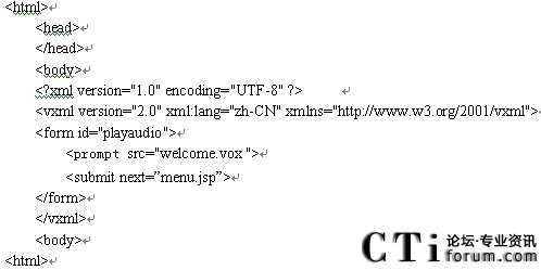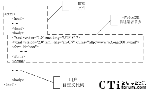 本文設(shè)計的IVR系統(tǒng)的流程文件是含有VoiceXML標簽的Web文件,因此,首先,文件的基本框架必須符合HTML文件框架。而對語音節(jié)點的具體描述是通過某個VoiceXML標簽或者某些具體標簽的集合,其語法符合VoiceXML語音規(guī)范。與此同時,有編程經(jīng)驗的用戶可以添加自定義代碼來定制一些具體Web數(shù)據(jù)操作,譬如,jsp或者asp的代碼。如圖3.6所示。
