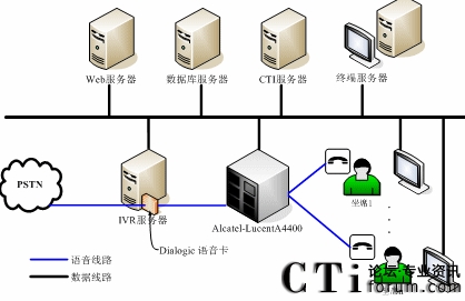 整個呼叫中心分存在兩種通訊方式:語音方式和數(shù)據(jù)方式。語音方式指的是傳統(tǒng)的電話線路,數(shù)據(jù)方式則是指的是各個應(yīng)用程序間的通訊交互線路。管理語音硬件的有Dialogic語音卡—負責(zé)整個系統(tǒng)的語音接入,并處理自動語音的相關(guān)動作;Alcatel-lucent