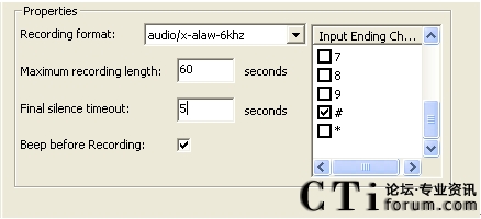 2)進入錄音流程,開始進行電話留言,如圖5.4所示,在錄音節(jié)點配置屬性對話框中,采用A率6Khz的錄音格式,最大錄音時長為60秒,靜音時間為5秒(表示如果在5秒鐘之內(nèi)如果沒有檢測到用戶的聲音,電話自動掛斷),打斷按鍵為“#”,進入下一步;