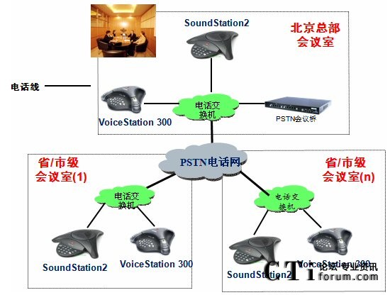 根據(jù)客戶的要求,本著“完善、經濟、高效”的原則,我們制定了以下解決方案;系統(tǒng)利用傳統(tǒng)電話網絡,擁有自己的會議管理系統(tǒng);北京總部方面使用Polycom SS2基本型商務會議電話;各個省/市級分會場,根據(jù)自己會場的情況自選設備;