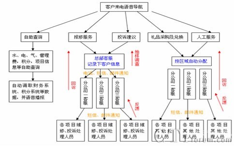 如上圖所示,客戶通過手機(jī)、電話、傳真機(jī)、IP話機(jī)等撥入XX物業(yè)全國(guó)統(tǒng)一服務(wù)熱線后,可根據(jù)系統(tǒng)語音導(dǎo)航選擇自助查詢、報(bào)修服務(wù)、投訴建議、禮品采購(gòu)及兌換、人工服務(wù)等業(yè)務(wù)?蛻魣(bào)修或投訴統(tǒng)一由總部受理,再轉(zhuǎn)給各分公司所屬項(xiàng)目處理;客戶選擇采購(gòu)及人工服務(wù),系統(tǒng)將根據(jù)客戶來電歸屬地將其就近接入當(dāng)?shù)匚飿I(yè)公司客服座席處理,如電話長(zhǎng)時(shí)間未被接聽,則系統(tǒng)會(huì)自動(dòng)把電話再轉(zhuǎn)到總部受理?偛繉⒍〞r(shí)采集各分部座席錄音、通話記錄等相關(guān)管理數(shù)據(jù)。