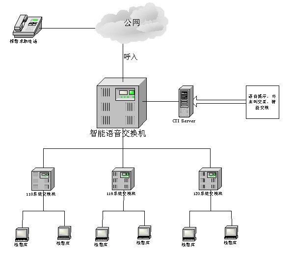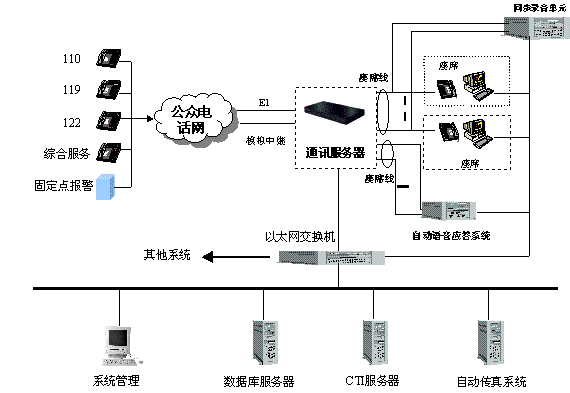 系統(tǒng)共包含4個(gè)E1,其中一個(gè)為公網(wǎng)呼入提供接口,另外三個(gè)可分別接入110、122(或120、119)。