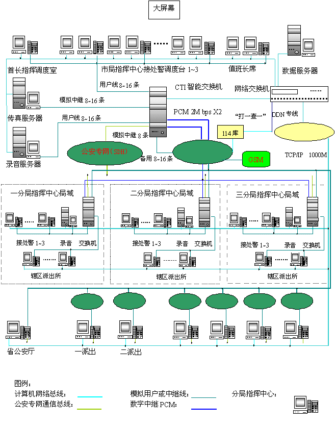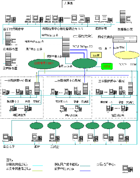 2M數(shù)字接口均與電信局程控交換機(jī)相連,公安城域網(wǎng)SDH傳輸通道作為110、119、122分流的備份傳送通道。