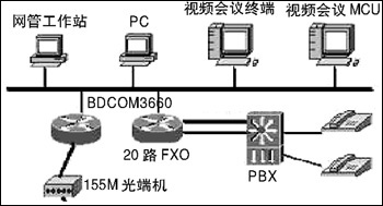 通過(guò)在BDCOM3660路由器上配置相應(yīng)的CE1、語(yǔ)音等功能模塊,中心20個(gè)E1接口可通過(guò)SDH連接17個(gè)地市氣象局和重要的氣象站(共20個(gè)),同時(shí)可供20部電話(huà)用以VoIP通話(huà);中心BDCOM3660路由器每臺(tái)配兩個(gè)10/100M以太網(wǎng)端口,使得數(shù)據(jù)和視頻分開(kāi),防止網(wǎng)絡(luò)的廣播風(fēng)暴。