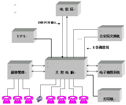 電信局交換機提供單獨數(shù)字2MB PCM中繼接口,通過HDSL傳輸設(shè)備或光端機設(shè)備將中繼接口連接到公安局指揮中心。若電信局與公安局距離小于500米,則可直接使用75歐姆電纜將中繼接口連接到公安局指揮中心。