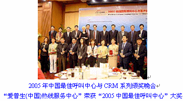 中國國際呼叫中心與客戶關系管理大會(ICC CHINA 2005)主辦的"中國最佳呼叫中心"的評選活動中,"愛普生(中國)熱線服務中心"憑借著自建成以來顯著改進并提升了公司運營管理水平及客戶滿意度,并且在很大程度上增加了由呼叫中心直接或間接為企業(yè)帶來利潤的絕對優(yōu)勢,從而榮獲此殊榮。
