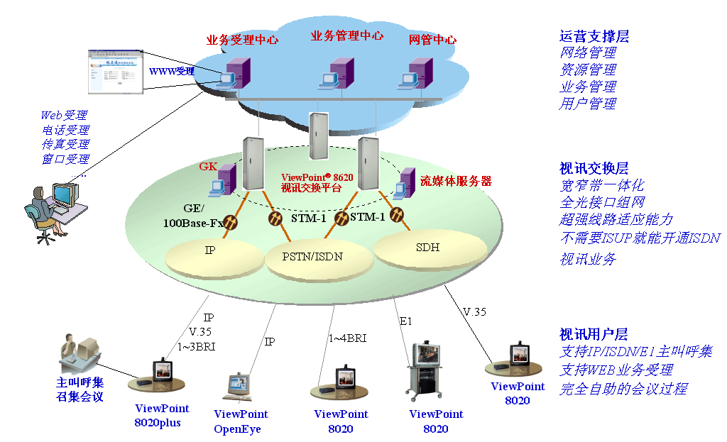 “視點(diǎn)通”ViewPoint®8000綜合視訊系統(tǒng)可以充分利用現(xiàn)有網(wǎng)絡(luò)資源,為網(wǎng)絡(luò)運(yùn)營商提供完善的訊業(yè)務(wù)運(yùn)營解決方案,使得視訊業(yè)務(wù)真正能夠廣泛服務(wù)于遠(yuǎn)程教學(xué)、企業(yè)會商、遠(yuǎn)程醫(yī)療、應(yīng)急通信、行政會議等領(lǐng)域,并逐步進(jìn)入千家萬戶。