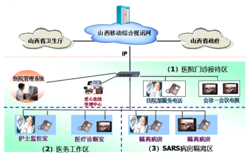 。。山西移動通信公司在獲悉遠(yuǎn)程視訊業(yè)務(wù)可以有效預(yù)防SARS的情況下,隨即與山西省政府、省衛(wèi)生廳通電話,表達(dá)了山西移動愿意為山西防治SARS工作提供更先進(jìn)的通信技術(shù)支持。山西移動與華為技術(shù)有限公司旋即制定了“愛心連線”遠(yuǎn)程醫(yī)療、遠(yuǎn)程探視實(shí)施方案,省衛(wèi)生廳及下屬太原市7家醫(yī)院要求盡快實(shí)施。目前該系統(tǒng)已經(jīng)在山西省山大第一醫(yī)院開通,正值國家衛(wèi)生部SARS督察小組在山西各大醫(yī)院視察“防非”工作,整個(gè)系統(tǒng)運(yùn)行穩(wěn)定,在SARS的防治工作中發(fā)揮了重要作用。