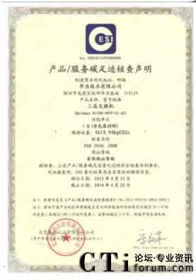 CTI論壇(ctiforum)5月23日消息(記者 楊佳林):全球領(lǐng)先的ICT解決方案供應商華為宣布,華為S5700系列交換機產(chǎn)品(共4款,S5700-28-EI-24S、S5700-48TP-SI-AC、S5700-52C-EI、S5700-52C-SI)經(jīng)中國電子技術(shù)標準化研究所認證中心(以下簡稱CESI)認證核查,產(chǎn)品碳足跡量化過程符合核查準則要求,獲得“碳足跡認證”證書。這是國內(nèi)第一張交換機產(chǎn)品碳足跡認證證書,10日在深圳舉行的“2012中國碳排放認證認可技術(shù)國際論壇”上,主辦方CESI向華為授予了該證書。