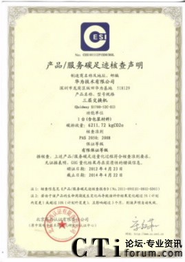 華為獲得國內(nèi)第一張交換機產(chǎn)品碳足跡認證證書