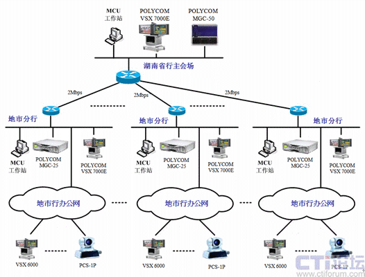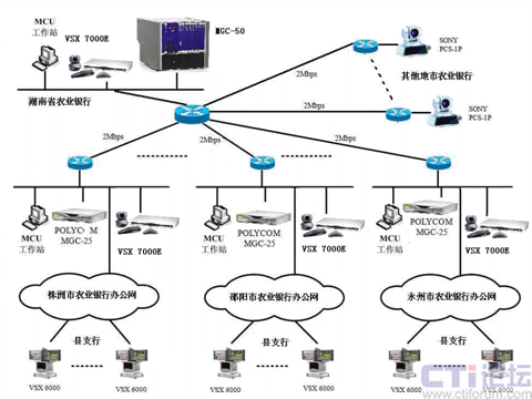 在株洲、邵陽和永州市行采用級聯(lián)的方式來實現(xiàn)。具體實現(xiàn)方式為:VSX 7000E則和地市行的MGC-25通訊,并且MGC-25負責其縣支行終端的接入,同時用MGC-50和MGC-25的端口級聯(lián),采用這種連接方式就可以實現(xiàn)從省行-地市行-縣支行的三級網視頻會議的召開。