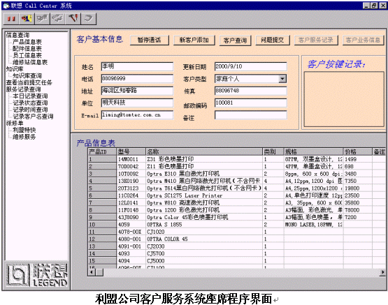聯(lián)想神州數(shù)碼電子商務(wù)部于2000年7月承建利盟中國(guó)公司客戶服務(wù)中心系統(tǒng),該客戶服務(wù)系統(tǒng)可以為利盟全國(guó)的用戶提供產(chǎn)品、信息、價(jià)格、咨詢等服務(wù);服務(wù)方式包括人工、語(yǔ)音、傳真、郵件等。