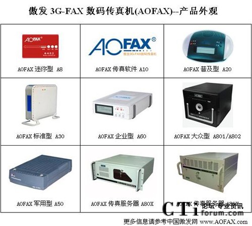 AOFAX系列電腦傳真產品擁有最齊全的型號,包括免費使用的AOFAX傳真軟件A10、SOHO/商旅人士便攜使用的AOFAX迷你型數碼傳真機A8、單電腦使用的AOFAX普及型數碼傳真機A20、4用戶環(huán)境的AOFAX標準型電子傳真機A30、軍警使用的AOFAX軍用型傳真系統(tǒng)A50、公安專用傳真服務器A51、營運版網絡傳真服務期A52、不限用戶數目的AOFAX企業(yè)型網絡傳真機A60、1至2線的AOFAX大眾型傳真服務器A801和A802,2至256傳真線路多種規(guī)格的AOFAX專業(yè)型傳真服務器A80X、跨區(qū)域大型公司使用的集團傳真系統(tǒng)和行業(yè)解決方案等,價格從幾百到幾十萬元,可適應各類型客戶的需求,以下為AOFAX全系列產品外觀圖。