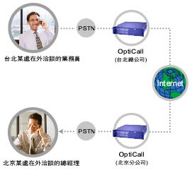 有了AltiGen提供的網(wǎng)路電話閘道器,跨國公司的臺(tái)北業(yè)務(wù)員只要花市內(nèi)電話的費(fèi)用,就可以跟北京出差的總經(jīng)理共商要事,節(jié)省的70 %以上的國際電話費(fèi)用。通訊流程如下: