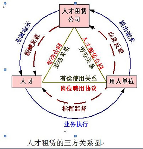 人才租賃有三方,人才租賃公司(或租賃機構(gòu)),人才(或員工)和用人單位(或企業(yè)),三方關(guān)系如下圖所示。用人單位與人才租賃公司是勞務(wù)關(guān)系:用人單位向人才租賃公司提出租賃請求,人才租賃公司接受請求,雙方簽訂租賃合同,由人才租賃公司向用人單位提供一次性或者是特定的勞動服務(wù),用人單位定期支付人才租賃公司相關(guān)費用,包括被租人才的工資、保險和人才租賃公司的經(jīng)營管理費用等;人才租賃公司與人才是勞動關(guān)系:人才租賃公司委派人才去用人單位工作,在此之前或此時雙方簽訂勞動合同,勞動者接受人才租賃公司的管理,從事人才租賃公司安排的工作,向人才租賃公司領(lǐng)取報酬;用人單位與人才是有償使用關(guān)系,人才到用人單位工作,并接受其管理,雙方簽訂崗位聘用協(xié)議,用人單位指揮、監(jiān)督人才進行工作,并負責(zé)將人才的使用情況反饋給人才租賃公司,由人才租賃公司對人才進行薪酬發(fā)放和激勵獎懲。