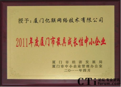 億聯(lián)喜獲2011年廈門市最具成長(zhǎng)性中小企業(yè)獎(jiǎng)