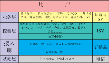 依靠五岳鑫公司強(qiáng)大的技術(shù)優(yōu)勢(shì)和對(duì)增值業(yè)務(wù)的深刻理解,以我公司自主研發(fā)的具有國(guó)際先進(jìn)水平的語音板卡為基礎(chǔ),為廣大增值業(yè)務(wù)服務(wù)商提供的語音增值業(yè)務(wù)綜合平臺(tái),將種類繁多的語音增值業(yè)務(wù)融合在一個(gè)系統(tǒng)平臺(tái)中。不僅支持行業(yè)內(nèi)大多數(shù)的語音增值業(yè)務(wù),還能方便、快速地面向市場(chǎng)提供各種的語音增值業(yè)務(wù)。