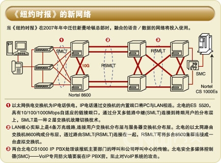 日前,《紐約時報》正在準備更換新的辦公地址,計劃明年春天搬進時代廣場內的一個新的配有先進設施的辦公樓中。除了玻璃+鋼鐵結構、沒有一點咖啡污漬的辦公桌和沒有面包屑的鍵盤外,大約3500名《紐約時報》雇員將被遷移到由北電獨家架設的集IP數(shù)據(jù)、語音和視頻統(tǒng)一的基礎設施網(wǎng)絡上。