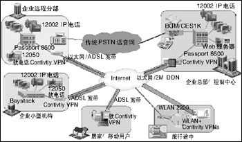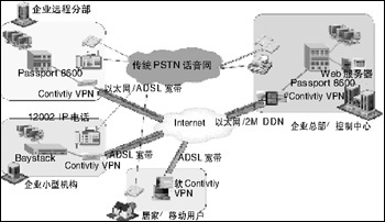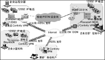 在企業(yè)網(wǎng)上加載北電網(wǎng)絡(luò)話(huà)音設(shè)備(BCM,CSE1K或ITG/M1),再配合上北電網(wǎng)絡(luò)的IP電話(huà)i2002/i2004,或在移動(dòng)用戶(hù)的PC上安裝i2050