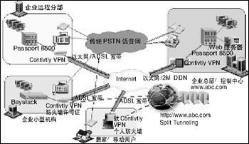 Tunneling)訪(fǎng)問(wèn)因特網(wǎng)時(shí),各遠(yuǎn)程/移動(dòng)辦公室的Contivity必須加載防火墻許可證,以攔截來(lái)自因特網(wǎng)的攻擊,而在移動(dòng)用戶(hù)的個(gè)人電腦上建議加載個(gè)人防火墻系統(tǒng)(如Sygate),以確保網(wǎng)絡(luò)安全。