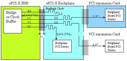 由于加了PCI-X,底板上的時(shí)鐘的長(zhǎng)度就成為關(guān)鍵了。規(guī)范的作者要定義應(yīng)能與各種底板互操作的SHB。這挑戰(zhàn)是在SHB上的PCI-X接口需要一個(gè)具有相等于底板上時(shí)鐘走線(xiàn)長(zhǎng)度延時(shí)的反饋時(shí)鐘。這反饋時(shí)鐘是在底板上并且它的長(zhǎng)度是以從SHB插槽到PCI插板插槽的時(shí)鐘的長(zhǎng)度為基礎(chǔ)的。在下面畫(huà)的圖中,從橋到三個(gè)目的地中任何一個(gè)的時(shí)鐘距離是相同長(zhǎng)度的。
