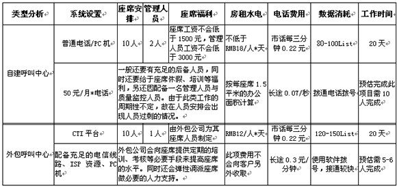 以上是以Telemarkering項(xiàng)目舉例,如需完成一萬(wàn)條數(shù)據(jù)的外呼工作,自建呼叫中心與外包型呼叫中心的區(qū)別。以上數(shù)字只是提現(xiàn)在設(shè)備、人員效率等方面問(wèn)題,另定期的人員培訓(xùn)及相關(guān)系統(tǒng)的維護(hù)將是費(fèi)用產(chǎn)生的一大因素。其實(shí)在項(xiàng)目的實(shí)施過(guò)程中發(fā)生的費(fèi)用只是一部分,從公司的運(yùn)營(yíng)角度看是可以節(jié)省很大的精力(例如:人員招聘、培訓(xùn)、福利待遇)及運(yùn)營(yíng)時(shí)間。