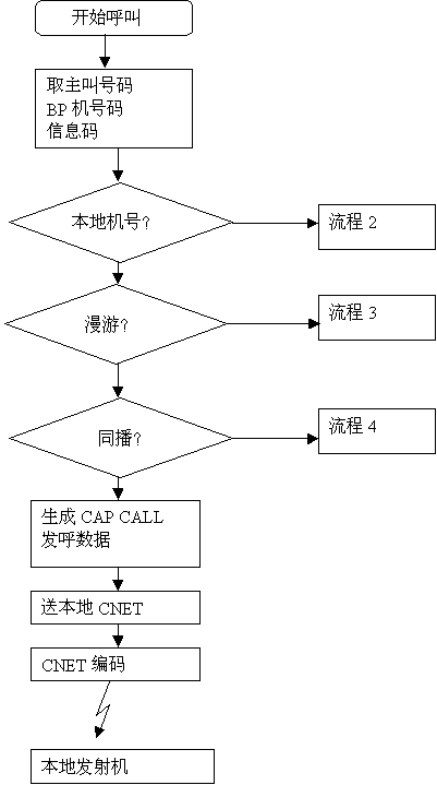 異地呼叫漫游到本地的異地機(jī)時(shí),異地發(fā)出的CAP CALL會送入本地發(fā)呼工作站,發(fā)呼工作站僅修改其目的地址,把它轉(zhuǎn)發(fā)給本地CNET由CNET送到編碼器編碼后送到發(fā)射機(jī)發(fā)射,完成呼叫過程。詳見流程5。