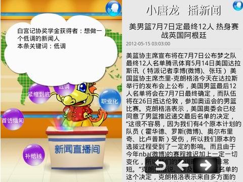 CTI論壇(ctiforum)5月17日消息(記者 歐陽(yáng)): 2012年5月9日,中國(guó)第一個(gè)全方位智能交互手機(jī)助手“小唐龍”正式上線,小唐龍是一個(gè)基于Android系統(tǒng)的智能手機(jī)助手,它可隨時(shí)隨地幫助手機(jī)用戶進(jìn)行聊天、歌曲點(diǎn)播、聽(tīng)新聞、地圖導(dǎo)航、互聯(lián)網(wǎng)信息查詢等多方面服務(wù),其中《唐龍新聞》以新穎獨(dú)特成為小唐龍的閃亮點(diǎn)。當(dāng)拿起手機(jī)對(duì)著“小唐龍”說(shuō),“聽(tīng)新聞”,“小唐龍”的播報(bào)便即刻開始——天下大事早知道,由我唐龍給您報(bào),我們來(lái)看今天的唐龍新聞。