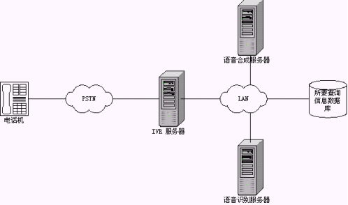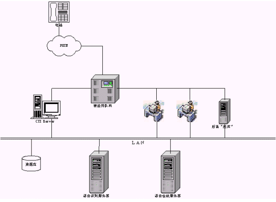 IVR模式是最常見的一種模式,這種模式也可以結合應用到前端以交換機接入的系統(tǒng)中去,在系統(tǒng)的IVR服務流程上,做出相應的修改,加入語音識別技術,同樣可以得到成功應用。另外一種模式暫且稱它為后備模式,該模式一個主要的特點是放在后端,比如在有座席接聽的情況下,采用語音識別技術的系統(tǒng)不被激活,也就是系統(tǒng)不給派線。當系統(tǒng)繁忙,而座席都占用的情況下,系統(tǒng)派線到采用語音識別技術的系統(tǒng),如同一個備用的座席。在這樣一個"座席"的軟件設計上,如同與人的交談一樣,系統(tǒng)也提出正常的詢問,但必須強調引導用戶來按照事先設定好的流程進行。這樣可以保證系統(tǒng)的接通率,特別是在一些對接通率和服務及時性要求比較高的場合采用,典型的代表如電信114查號臺和移動的1860客服中心,這些系統(tǒng)往往是隨著用戶急劇增加,撥打量也在穩(wěn)步上升,而呼叫響應要求及時。系統(tǒng)拓撲結構如下圖示。