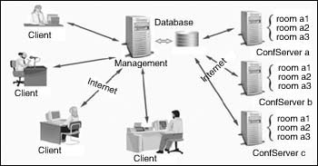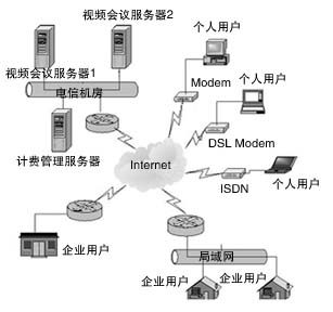 用戶可通過從56K撥號上網(wǎng)直至寬帶等各種方式接入該視頻會議系統(tǒng),包括PSTN撥號、ISDN撥號、ADSL撥號、LAN、PLC(低壓電力載波)等各種形式,在這個統(tǒng)一的視頻會議平臺上,實現(xiàn)多路音頻、多路視頻、文檔共享、電子白板、協(xié)同瀏覽、文件傳輸、文字交流等功能。系統(tǒng)的拓?fù)浣Y(jié)構(gòu)圖如左所示。