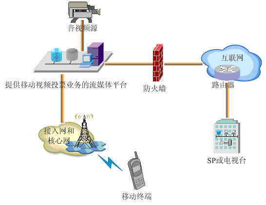 運(yùn)營(yíng)商建設(shè)的提供移動(dòng)視頻投票業(yè)務(wù)的移動(dòng)流媒體平臺(tái),該系統(tǒng)一方面可以接入電視信號(hào)向用戶即時(shí)播放音視頻賽況或搖珠過(guò)程,另一方面可以向用戶顯示賽況介紹和接收用戶的投票并進(jìn)行計(jì)費(fèi)處理。