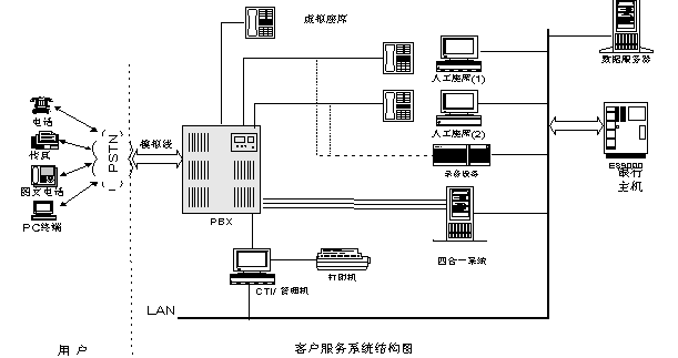 銀行的客戶服務(wù)中心為客戶提供一種新型服務(wù),由一組受過專業(yè)訓(xùn)練的人員來處理客戶的來電。客戶來電經(jīng)自動(dòng)語音應(yīng)答系統(tǒng)指導(dǎo),或直接選擇自己關(guān)心的信息,或轉(zhuǎn)接到人工座席服務(wù)系統(tǒng),由最適合的業(yè)務(wù)人員接聽電話。當(dāng)業(yè)務(wù)人員拿起電話時(shí),已經(jīng)在電腦屏幕上看到了客戶的背景資料和服務(wù)所需信息,因此業(yè)務(wù)人員能提供最友好最專業(yè)的服務(wù),以提高金融企業(yè)整體服務(wù)形象,增強(qiáng)競爭力。
