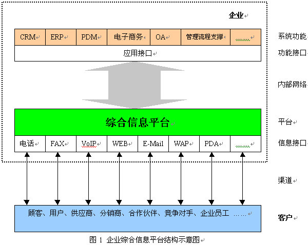 CENTER、電子商務等,它們之間是什么關系,怎么實施,我想這是目前眾多企業(yè)所面臨的普遍問題,這也正是企業(yè)信息化建設過程中必須解決的問題。企業(yè)信息化建設是一個整體的系統(tǒng)解決方案,各個信息化模塊(環(huán)節(jié))都在履行自己的業(yè)務處理功能和信息處理功能,相互之間又有著各種內在的聯(lián)系。我們知道,ERP解決的是諸如倉庫庫存、銷售訂單、生產與成本控制,等等;BRP解決的是管理流程優(yōu)化、崗位、崗位職責等問題;CRM主要是針對市場、銷售和客戶服務,提供客戶管理及數(shù)據(jù)分析功能。事實告訴我們,上述這些信息化模塊目前只能提供單一或僅有幾種與客戶溝通的方式,例如Web、E-mail,個別CRM軟件提供電話接入功能,此外,它們都不提供專職的客戶服務坐席,更不必說提供柔性化的、人性化的、雙向互動的服務了。因此,實際上企業(yè)就迫切需要建設一個綜合的信息平臺,以此向客戶提供方便的、多種聯(lián)絡方式的、足夠容量的、良好服務質量的、較高效率和較低成本的溝通渠道。通過這樣的渠道,企業(yè)可以與客戶建立溝通關系,滿足客戶對企業(yè)多樣的、變化的需求。