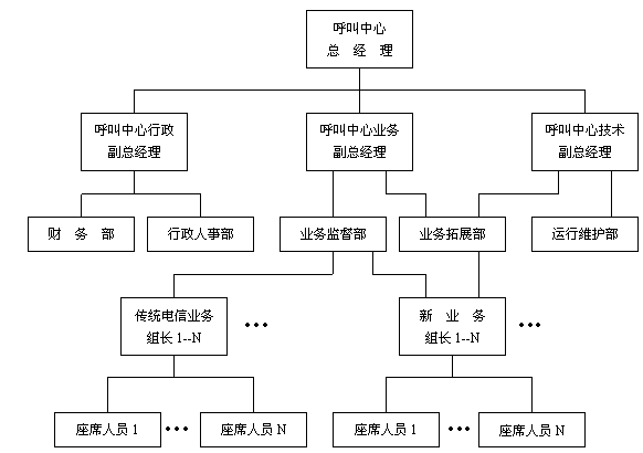 上圖是我們建議的呼叫中心組織結(jié)構(gòu)圖,其中業(yè)務(wù)監(jiān)督部門、業(yè)務(wù)拓展部門和運行維護(hù)部門是呼叫中心最關(guān)鍵的部門,財務(wù)部和行政人事部是三大核心部門的支撐部門。