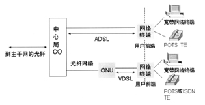 對數(shù)字信號處理要求,而且更加重要的是收發(fā)機成本與ADSL系統(tǒng)相比可以大大地降低。因此,對于用戶來說,假如采用了質量較好的配線或引入線,那么,將FTTC(光纖到路邊)技術,尤其是APON技術與VDSL技術相結合,作為ONU(光網(wǎng)絡單元)到用戶間的配線,通過FTTC為企業(yè)用戶和家庭提供寬帶接入,這樣可以實現(xiàn)設備成本和帶寬能力方面的平衡,由此看來,VDSL是一種比較現(xiàn)實理想的寬帶混合接入方案。VDSL拓撲結構如圖1所示。
