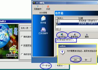 3、點按主窗口下方的"覓友"按鈕,彈出的對話框中選擇三種添加方式之一后按"下一步"進行好友的添加;當有人加你為好友時,系統(tǒng)會有提示音閃并DICO圖標在任務欄不斷閃爍,你點擊上來后會彈出你的DICO郵箱對話框并收到有某某加你為好友的消息,此時可先點按"查看資料"了解一下來人相關信息;若有意可點按"加產(chǎn)好友"加來訪者為好友(下圖7)。