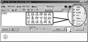 MSN與ICQ都有消息群發(fā)功能。但MSN只能通過“邀請(qǐng)其他聯(lián)系人加入”的方式進(jìn)行,而且有最多加入四人(共五人)的限制。但I(xiàn)CQ的消息群發(fā)功能卻很強(qiáng)大。在對(duì)話模式下,單擊“Multiple”即可展開所有好友的列表。沒有人數(shù)限制,也沒有在線與否的限制(如圖2)。