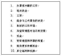 10. 來(lái)自公司高層的認(rèn)可。這是一個(gè)非常有效的作法,能得到公司高層的認(rèn)可對(duì)很多人來(lái)說(shuō),是一生都可以值得回憶的事情。如果在一家全球的大公司,和公司CEO共同進(jìn)餐,得到公司CEO的親筆信,和CEO合影等都是非常高的榮譽(yù)。當(dāng)然,這個(gè)作法不是可以經(jīng)常用的。因?yàn),如果用得太?jīng)常了,就可以失去了一種"神秘感"或"來(lái)之不易"的感覺(jué)。